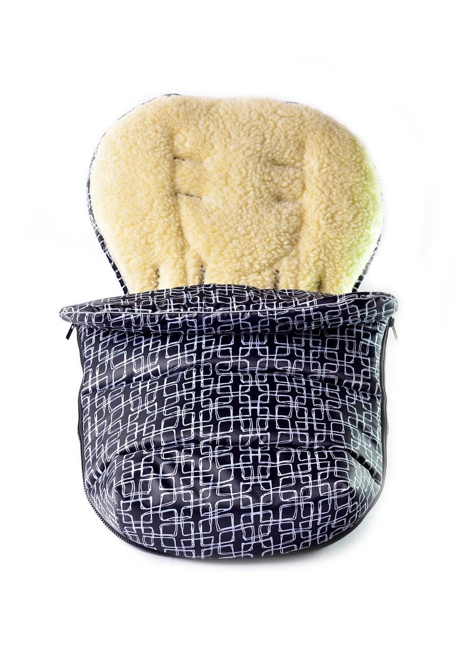 | Додаткові характеристики | Внутрішня підкладка з текстильної овчини (30% вовна) і синтепону допоможуть зберігати тепло Широкий отвір з блискавкою для регулювання температури і легкого доступу до вашої дитини При більш теплій погоді можна використовувати в якості прокладки на сидіння, від'єднавши передню частину Захисна підкладка оберігає внутрішню поверхню від брудного взуття Сумісність з п'ятиточковою і триточкового системою ременів безпеки, додаткові зав'язки для надійного кріплення до візка |